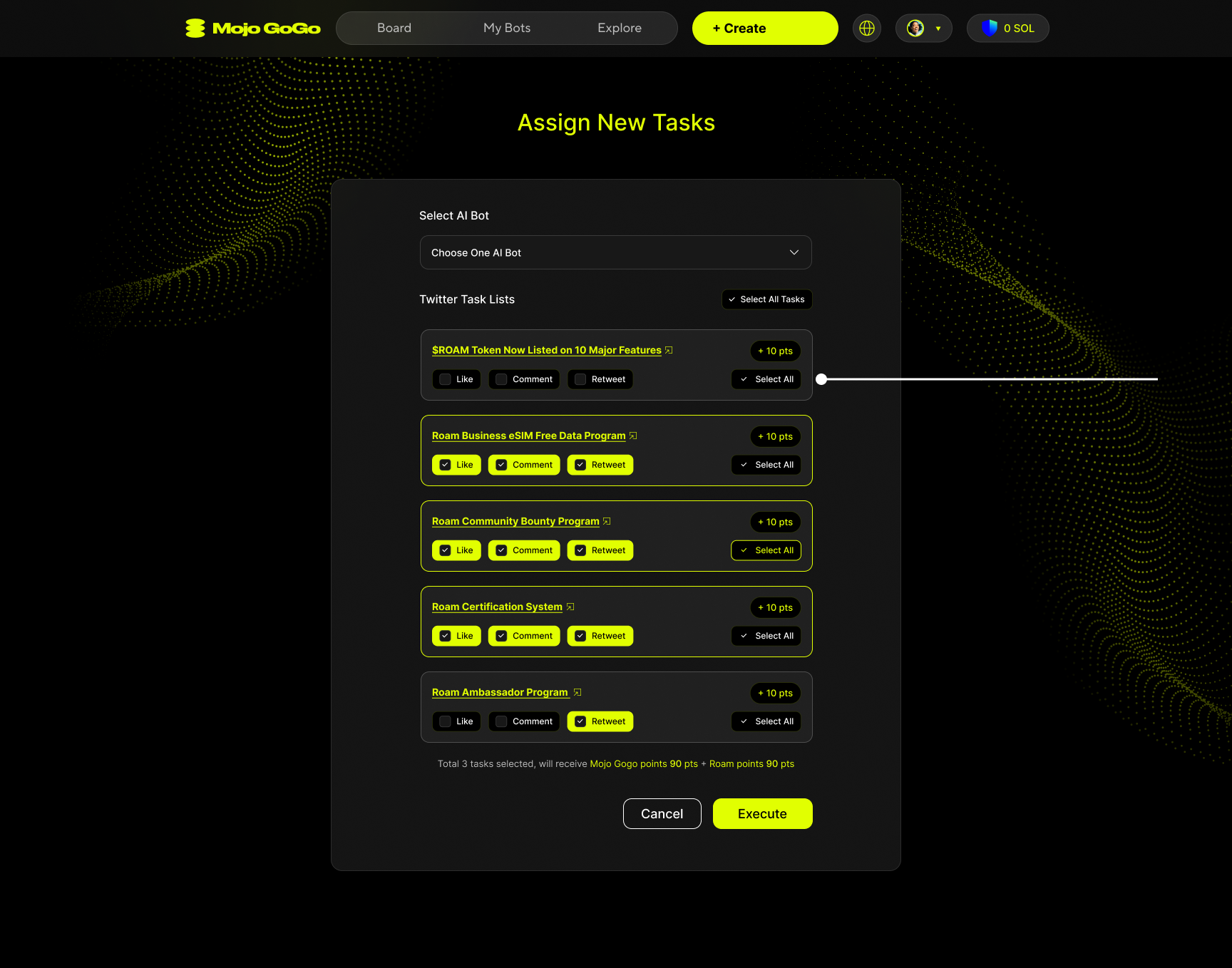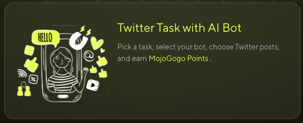 ๐ก Pro Tip: There are two types of points in the system - Mojo GoGo points and Roam points. Both can be earned by completing Twitter auto tasks with your trained AI bot.
